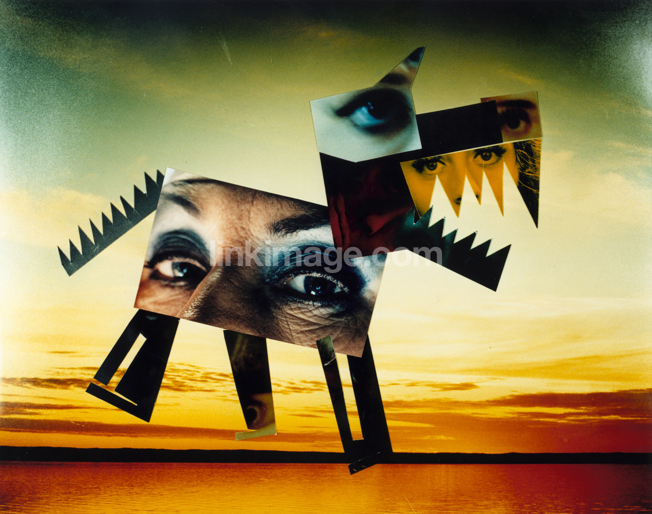 dog, eyes, sky, collage, tags, sunset, orange, blue, abstract, pattern, form, horizon