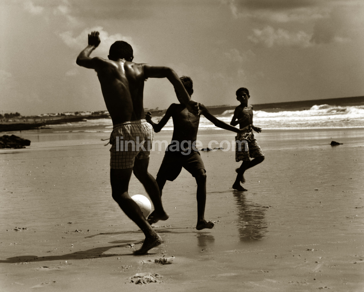 - plays, shore, football, guys, brazil, sandy beach, water, sea, lake, play, half-naked, only, torsos
