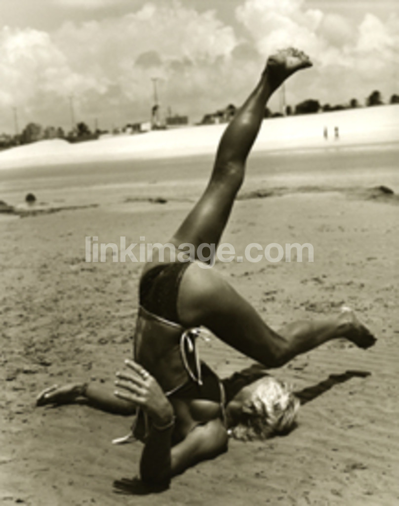 bikini, women, shore, movement, brazil, butt, feet, pointing, up, in, air, sand, shadow, sky, cloud