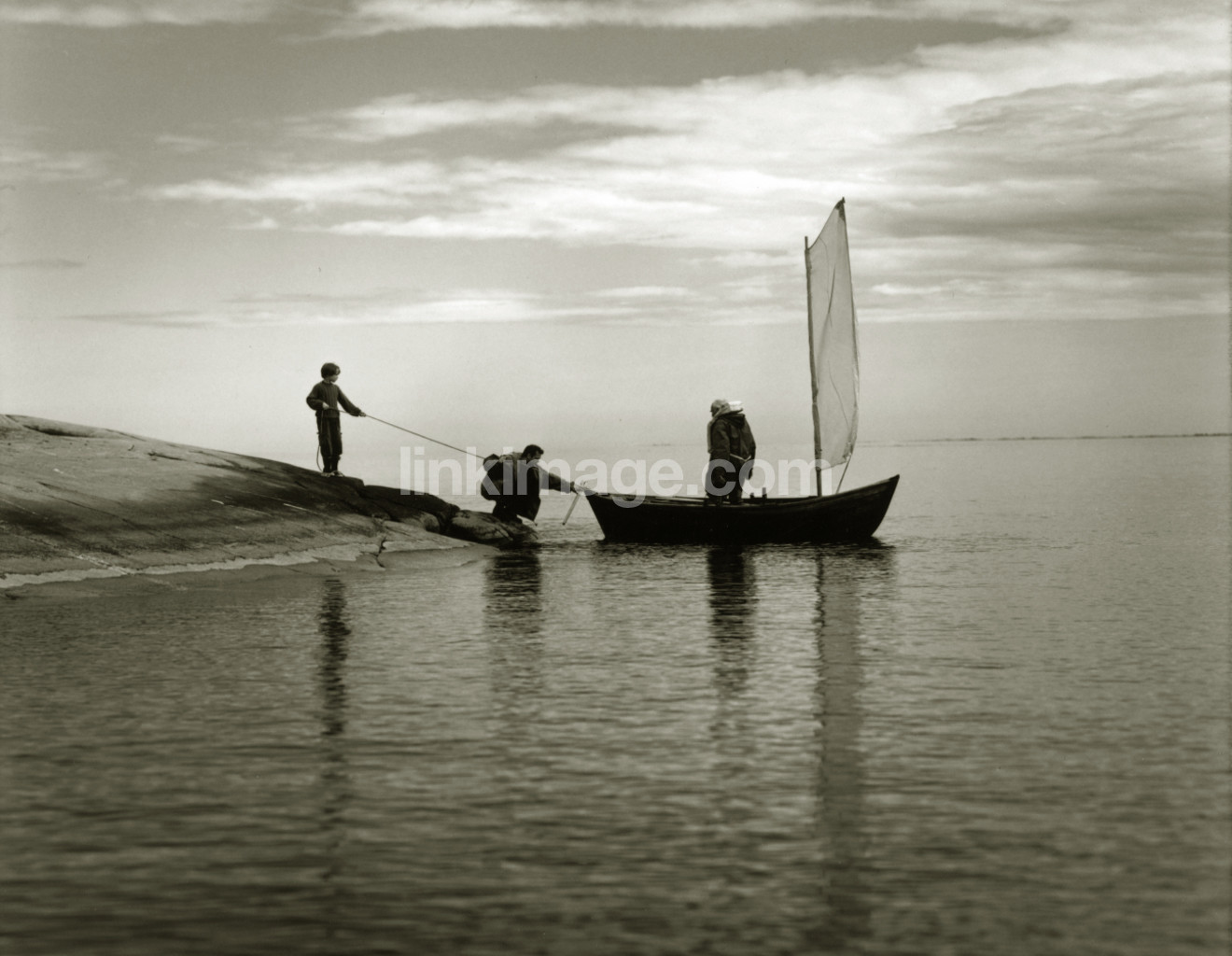 boat, sail, three, boy, archipelago, hold, line, sailboat, dinghy, small, water, lake, sea, float, rock, sky, cloud, horizon