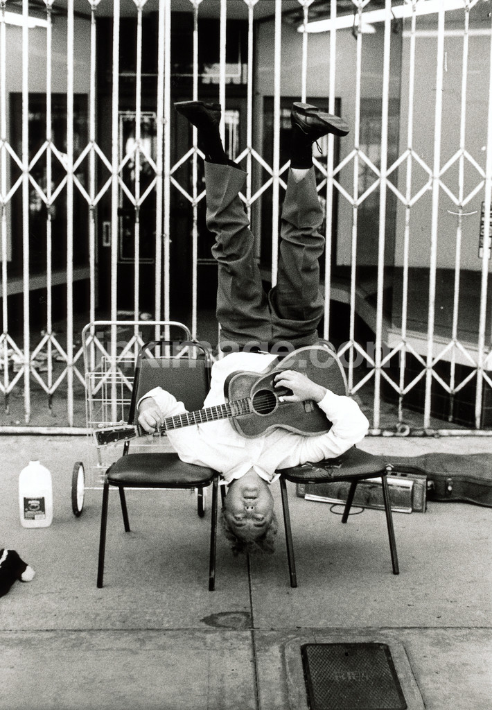 male, upsidedown, guitar, chairs, guitar, up, and, down, facing, upside, between