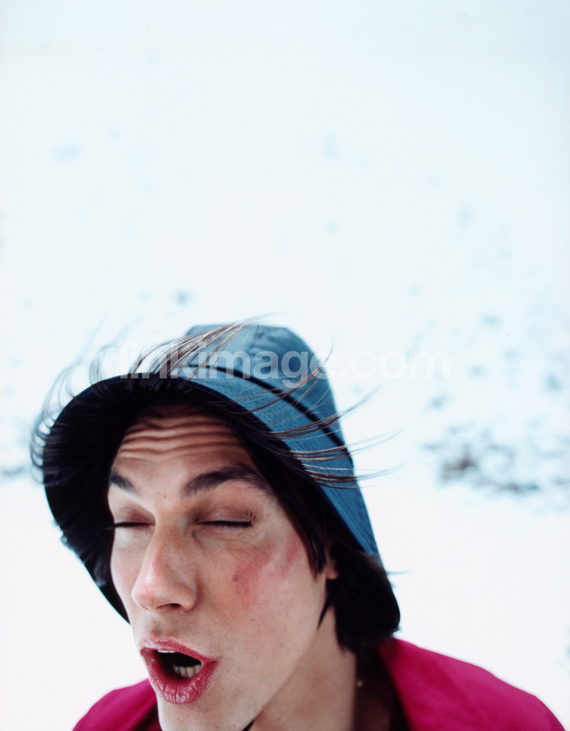 - male, an, cap, blowing, eyes, peers, mouth, guy, blowing, hat, close your eyes, hair, open