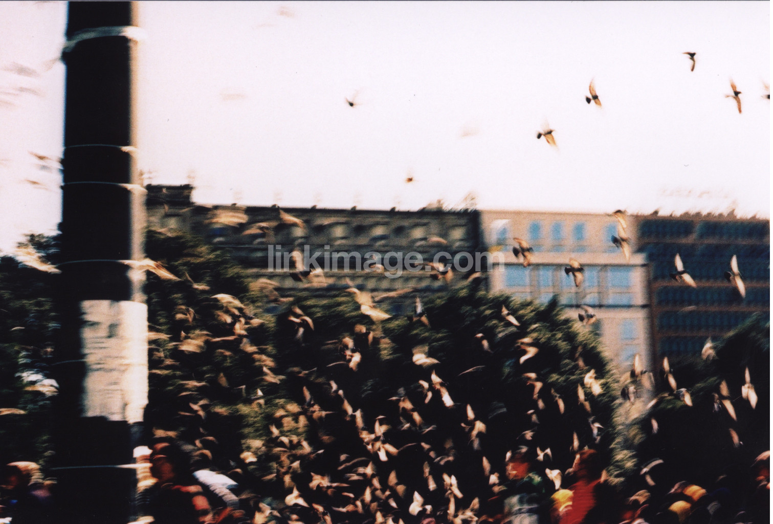 square, city, building, birds, pigeons, flies, fly, movement, many, post, fuzzy, blurred