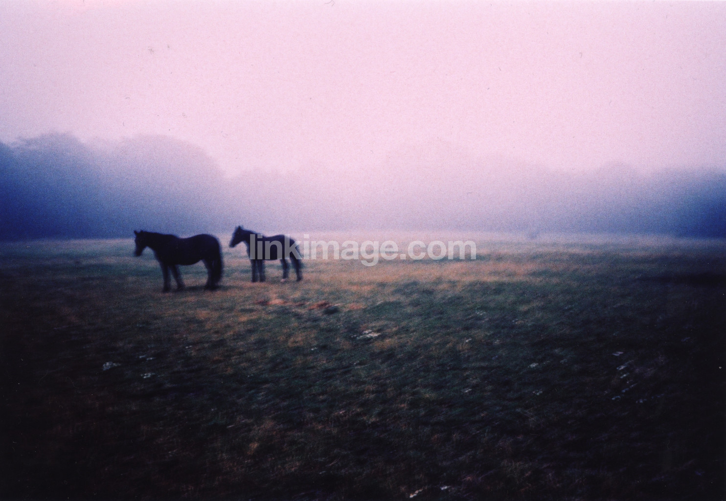 horses, field, dusk, dawn, pony, animals, grass, horse, fog, haze, black, forest, spot
