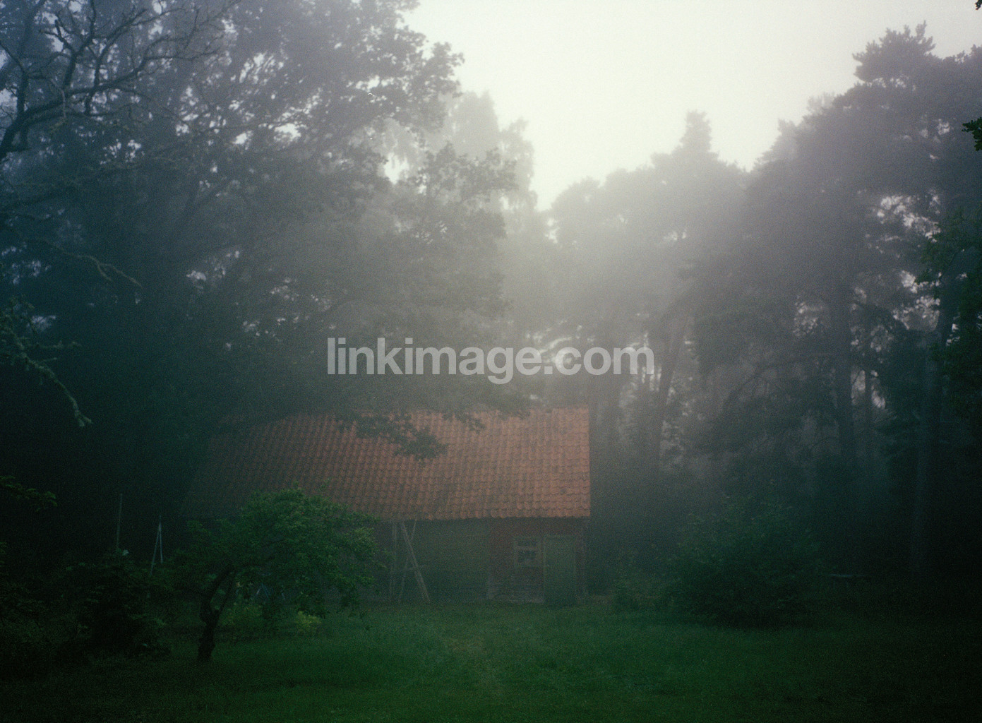 fog, obscured, croft, summer, house, mystery, forest, tree, haze, cottage, branches