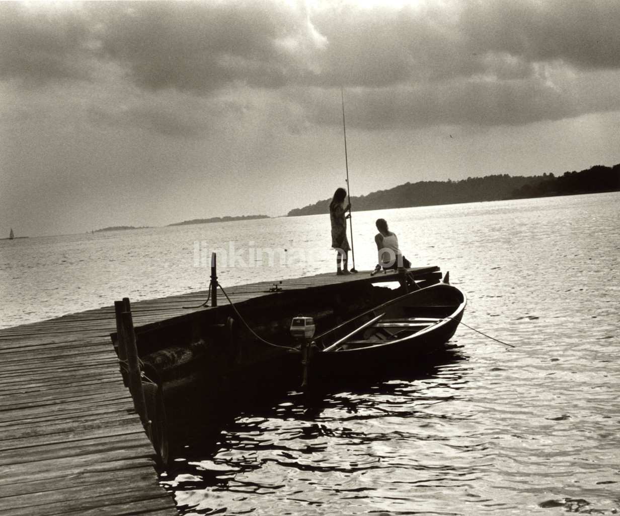 summer, water, boat, pier, family, mother, children, fishing, rod, light, shining, by, cloud