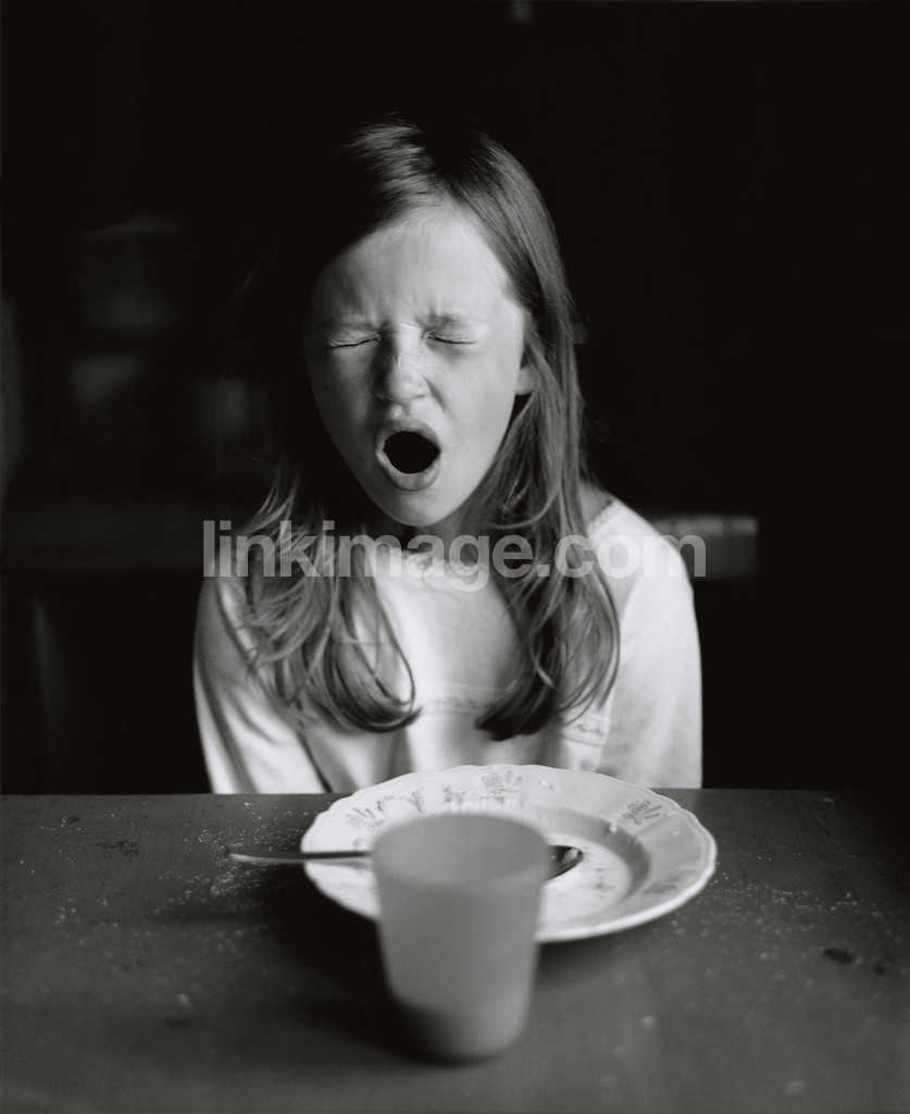 girl, children, youth, eat, meal, breakfast, yawn, porridge, close your eyes, plate, plastic, mug