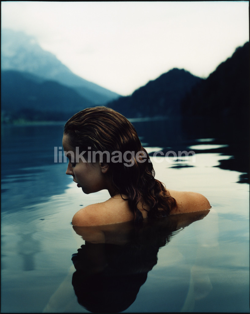 - female, girl, water, lake, swim, blue, in, shoulders, back, rock, wet, nude, skin, hair, summer