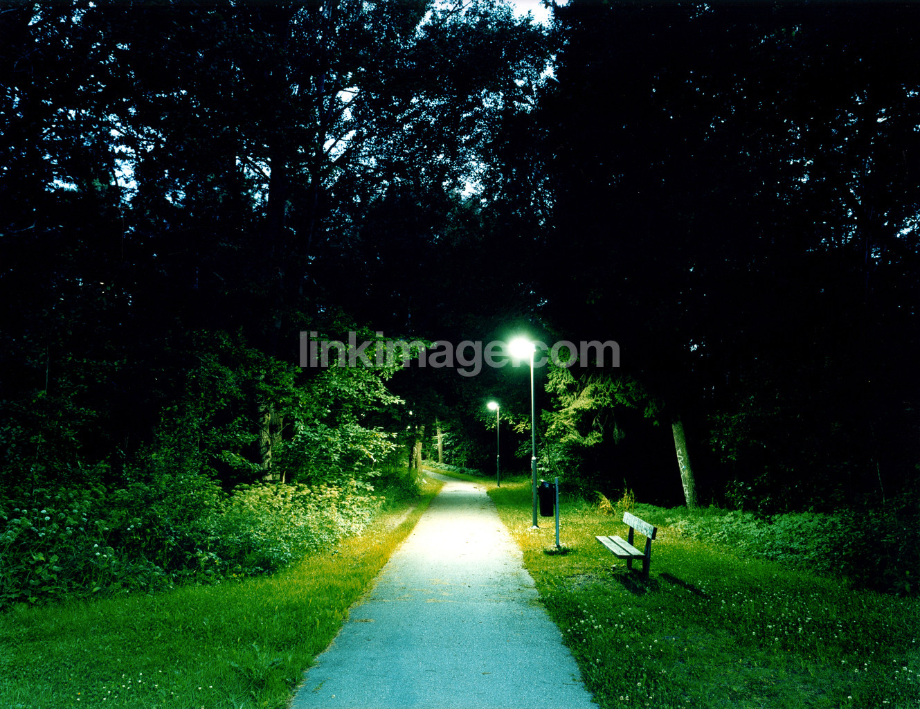 path, road, suburb, forest, wood, light, lamppost, lights, fate, bench, bushes, grass, night, dusk, tree
