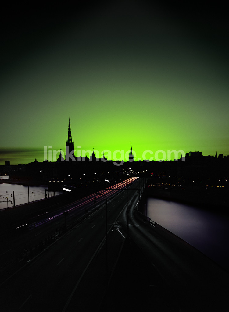 city, water, dusk, dawn, sunset, night, horizon, sky, bridge, green, silhouette