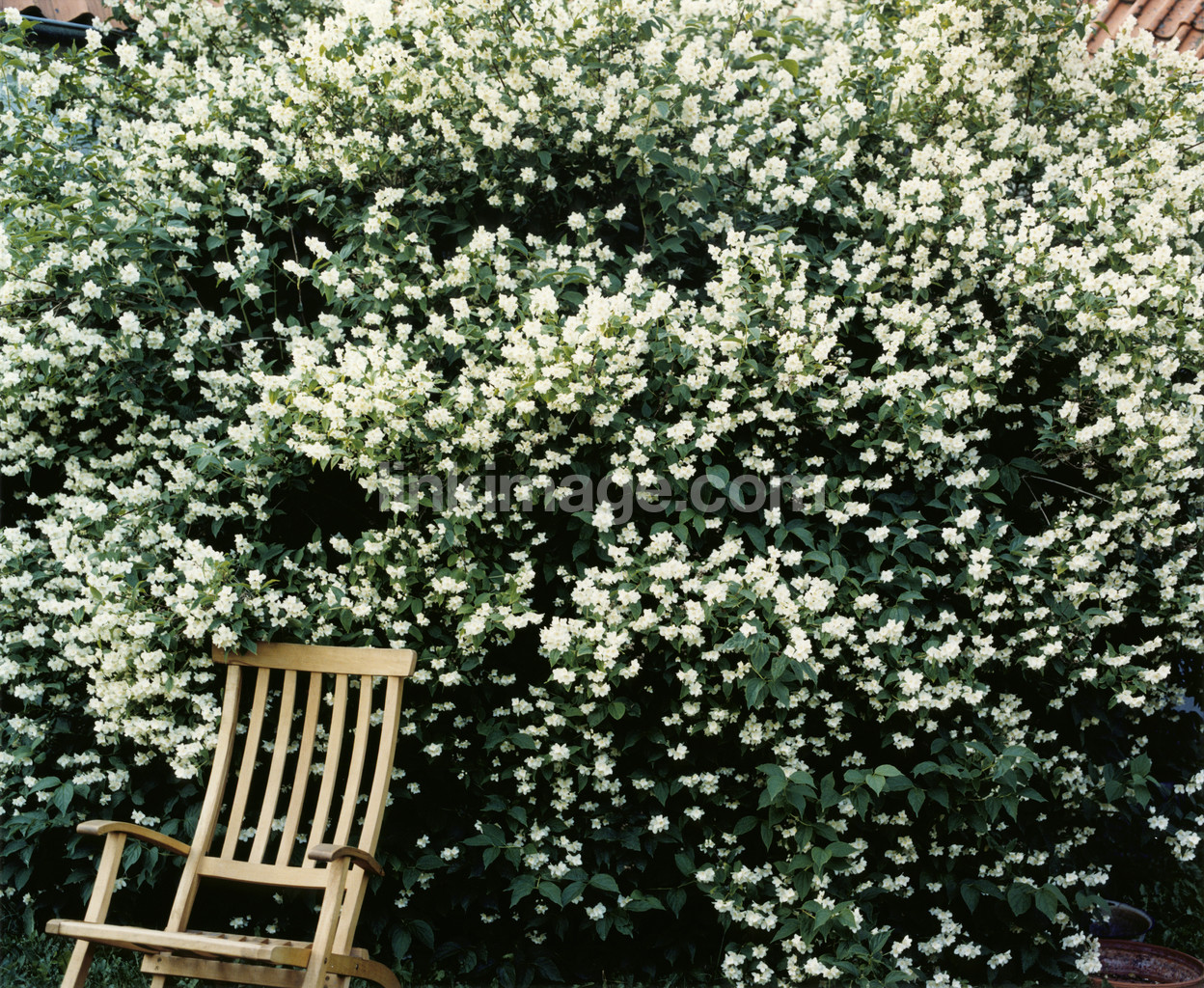 garden, bush, chair, flowers, white, jasmine, spring, summer, shrubbery, wooden chair, bk637