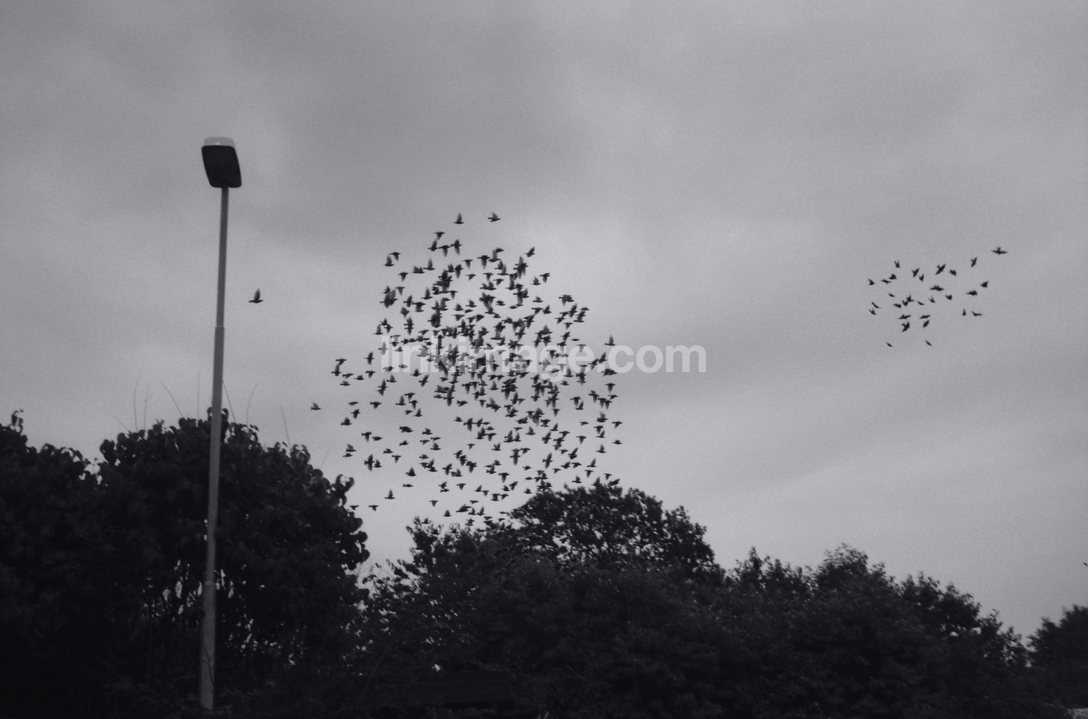 tree, sky, bird, lamppost, dusk, evening, floc, birds, overcast, cloudy, tree tops, bk1259