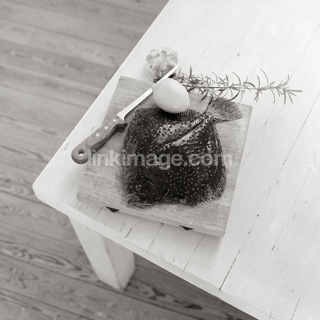 feed, dinner, knife, floor, table, meal, fish, flounder, lemon, garlic, spice, summer, archipelago, cutting board, bk1406
