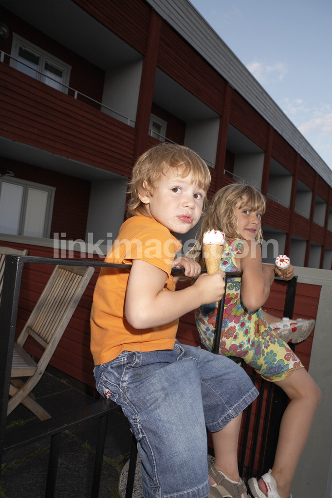 children, climbs, homes, glasses, siblings, bus, ice cream, eat, building, hyseshus, housing
