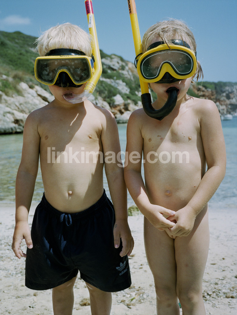 - boy, girl, siblings, brothers, sisters, friends, friend, summer, shore, sand, holiday, leave, water, pop, snorkel, play, er116