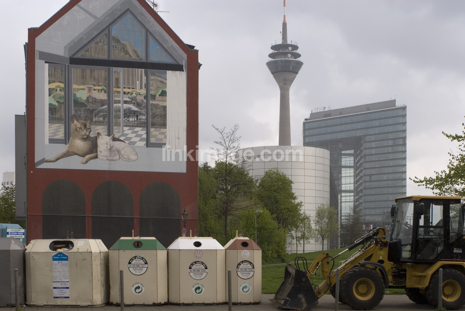 - backhoe, tv tower, recycling bins, façade, painting, environmental, recycling, garbage, waste, debris