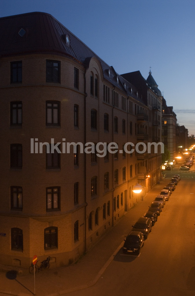 - city, cars, dusk, parking, streetlights, house, housing, street, evening
