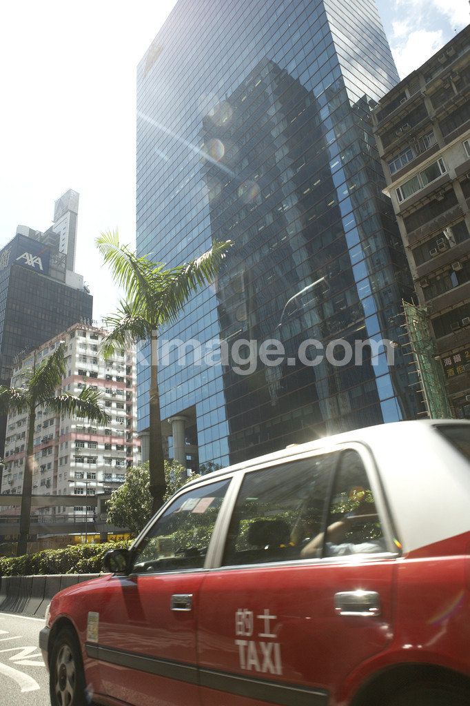 - taxi, car, red, city, buildings, skyscrapers, reflex tions, traffic, speed, movement