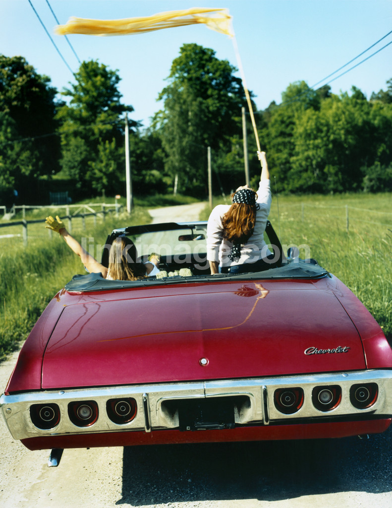 - car, red, summer, flag, friend, friends, girlfriends, grass, tree, forest, happy, female, independent, freedom, classic car, convertible, convertable, holiday, trip, gravel road, country, dg219