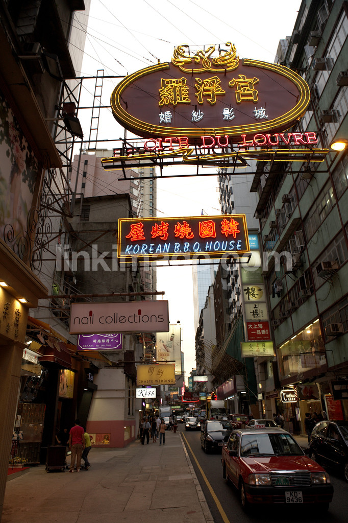 - city, house, neon, characters, cars, traffic, street, text, drive, information