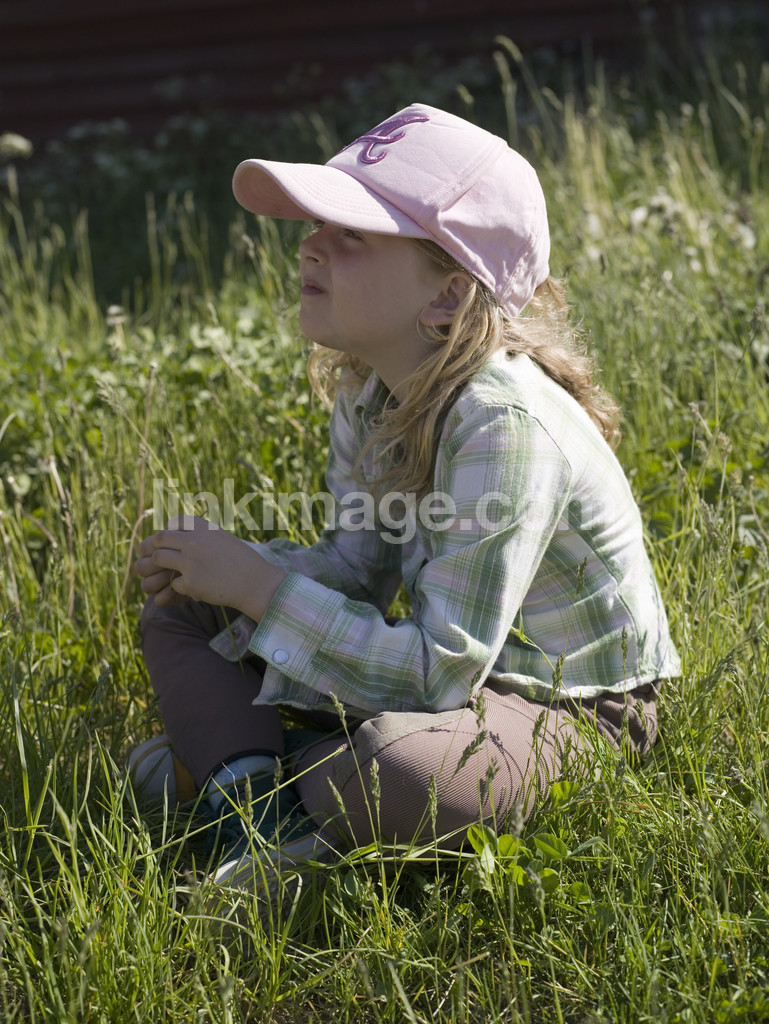 cap, alone, portrait, girl, children, looking, curiously, summer, grass