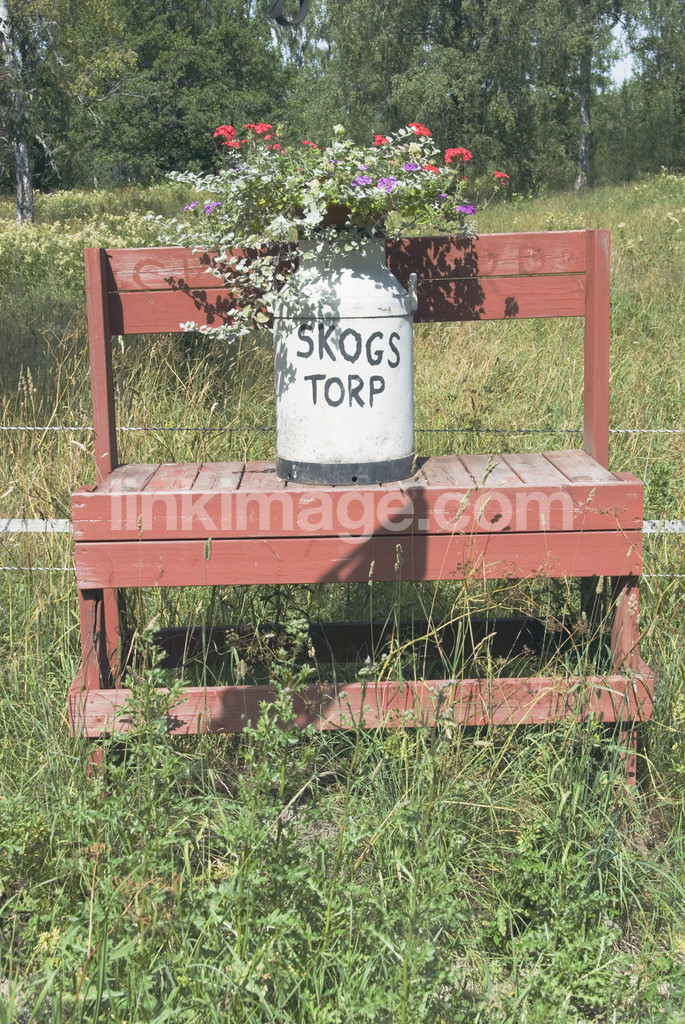 - croft, summerhouse, bench, flowers, milk jug, summer, rural, country, homes