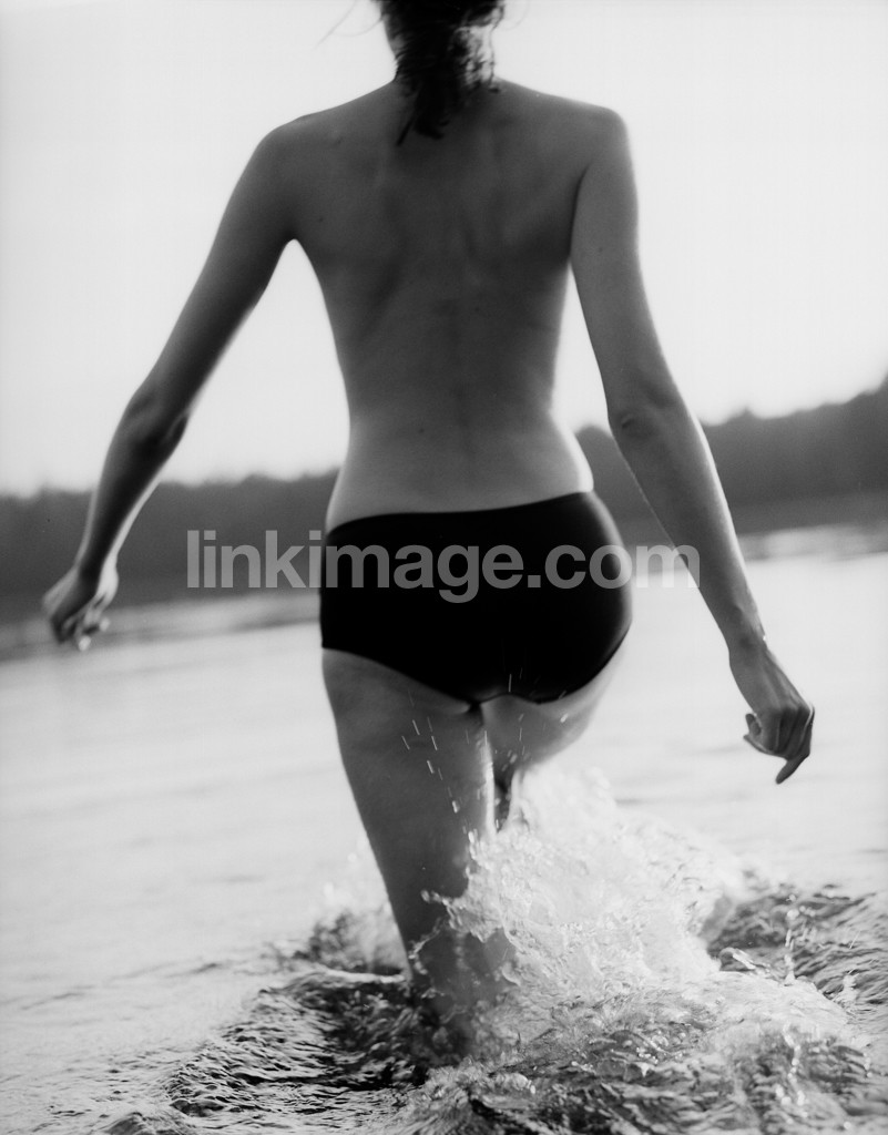 female, swim, summer, lake, water, back, bikini, wade, half naked, bar, chested