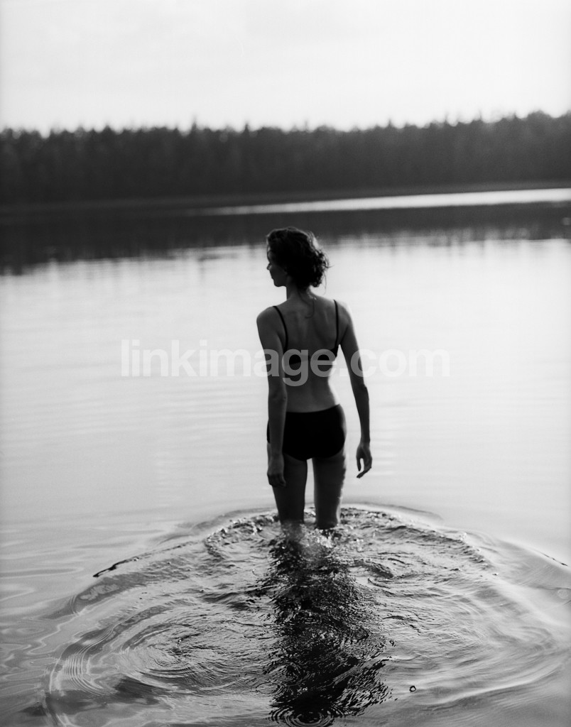 - female, water, lake, summer, swim, bikini, wade, wade forest, reflection