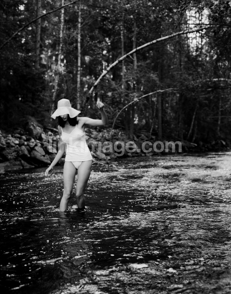 - swim, female, lake, tree, forest, summer, wade, wade, hat, river, stream, on, flows