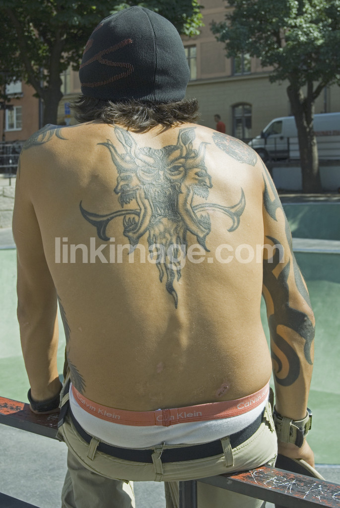 - tattoo, back, guy, male, skateboard