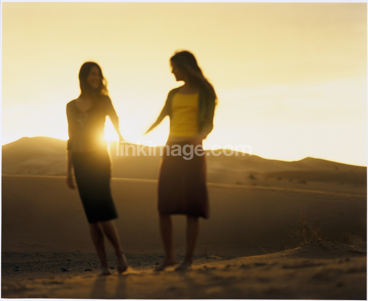 - desert, sand, sun, rock, two, women, friends, sunset, friendship