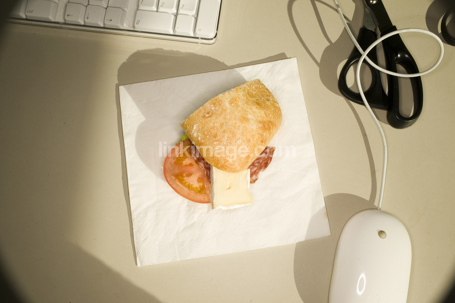 office, work, mouse, scissors, sandwich, lunch, brie, tomato, salami, break, food, workplaces
