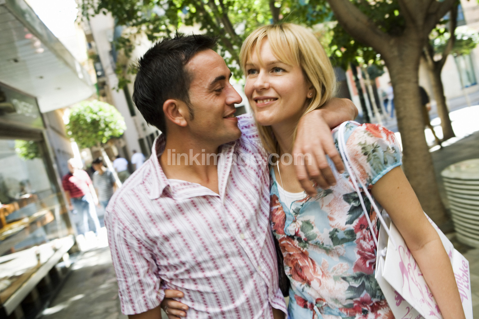 - city, saunter, together, unscheduled, shop, couple, pleasure, proximity, holiday