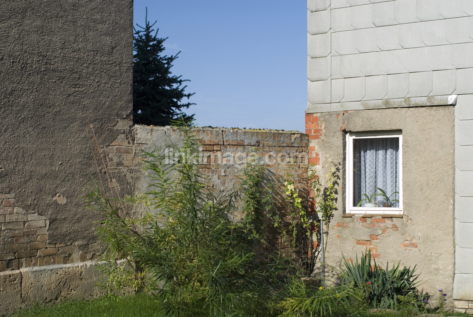 bush, spruce, window, sky, wall, building