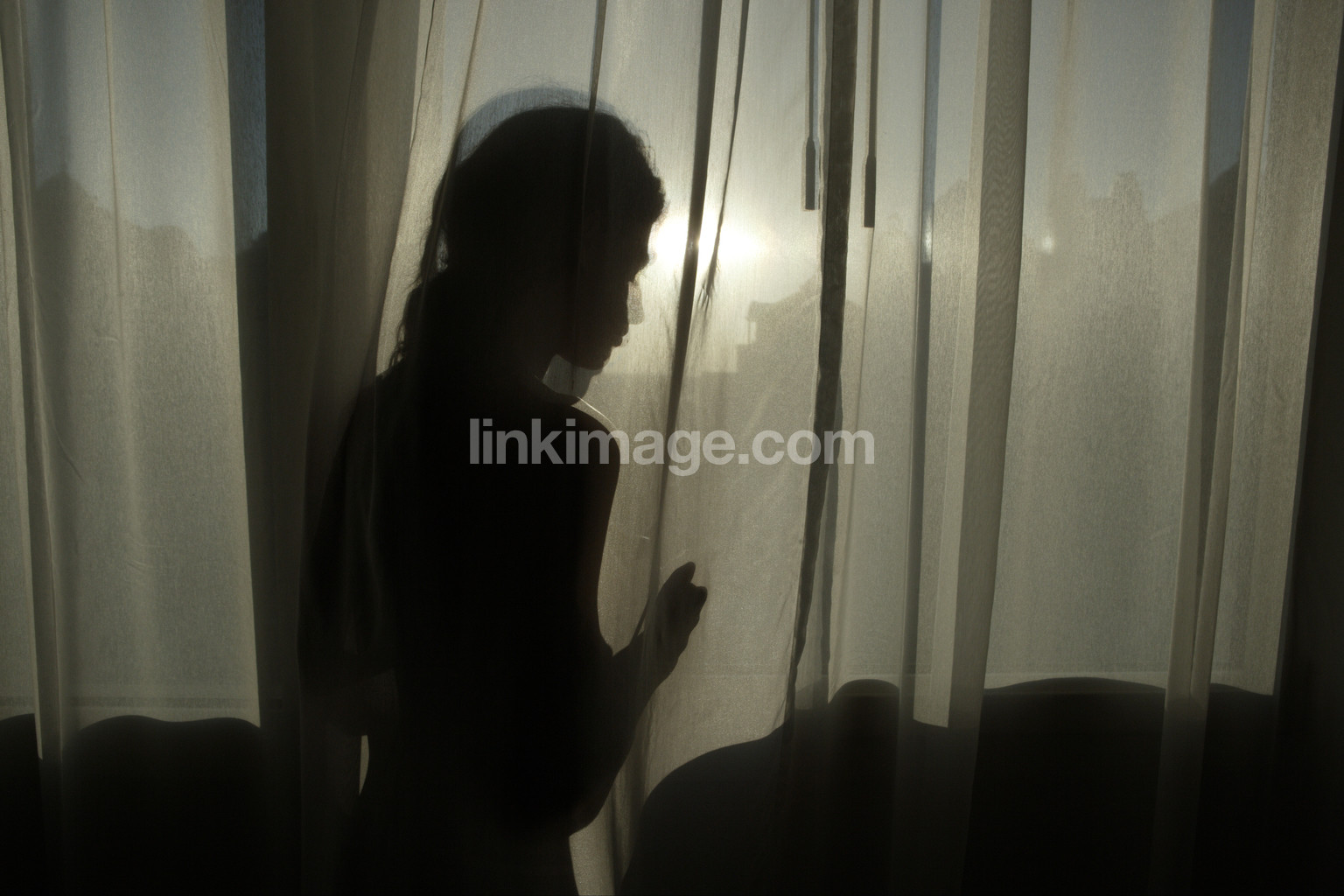 - silhouette, window, sun, curtain, female, alone, loneliness, waiting, looking, views, sl2062