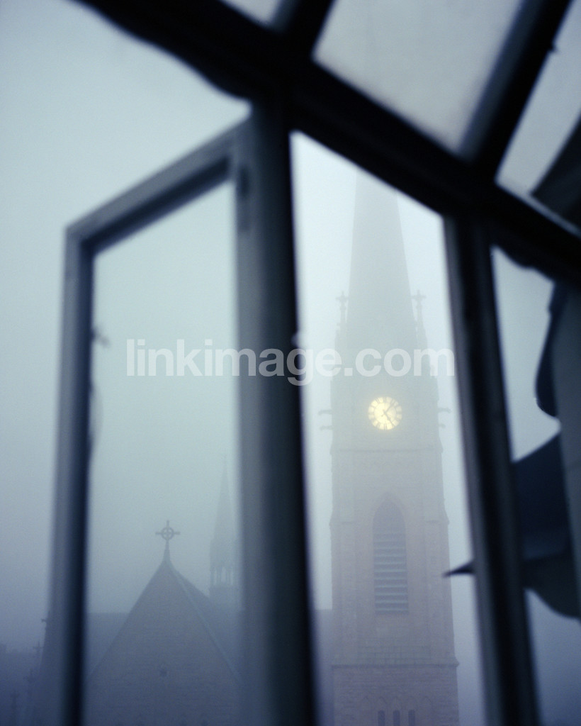 church, fog, clock, digits, blue, mystery, drama, window, tower, symbols, time, city, haze