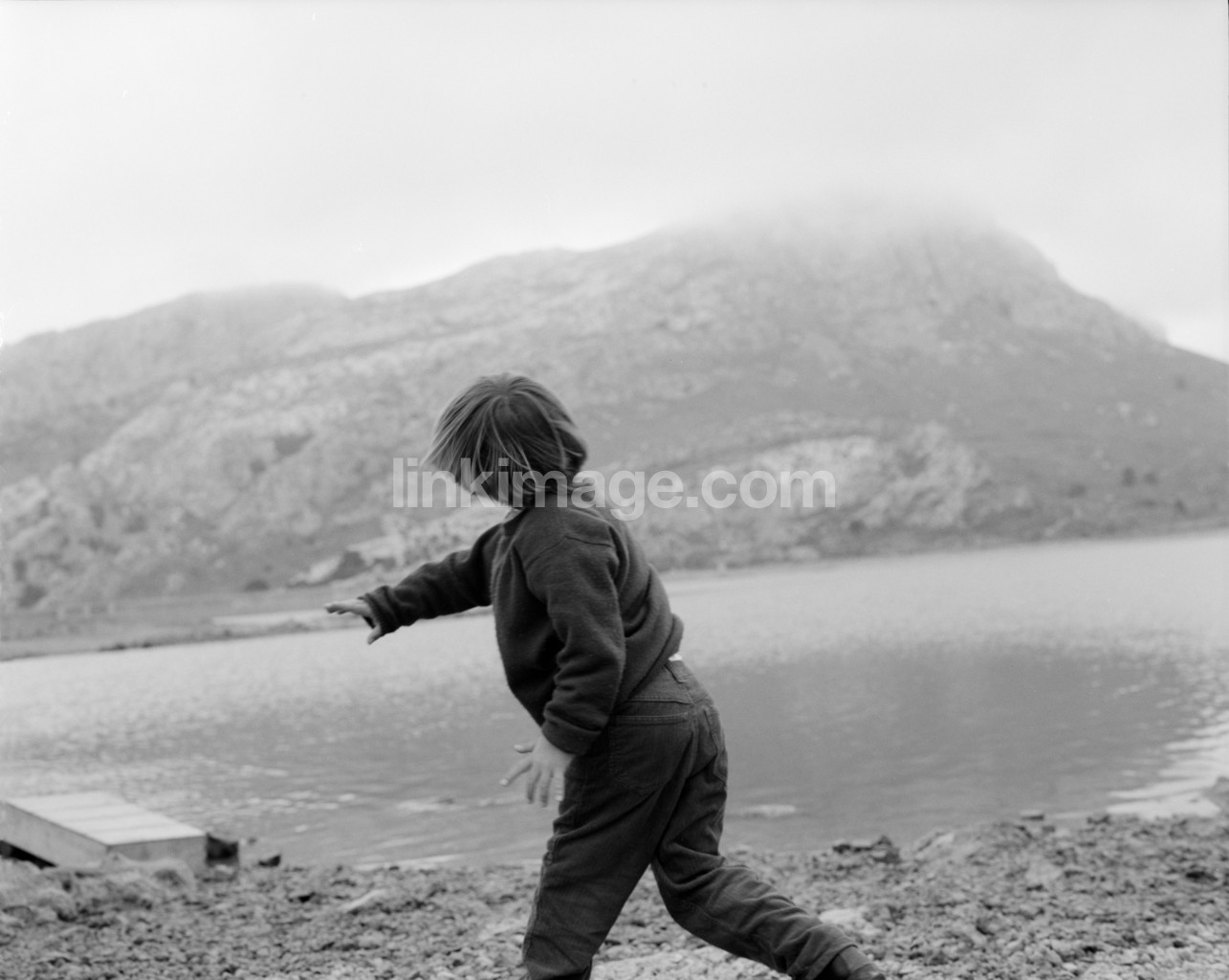 chuck, boy, water, play, children, stone, lake, sea, rock, hill, slope, shore, bridge
