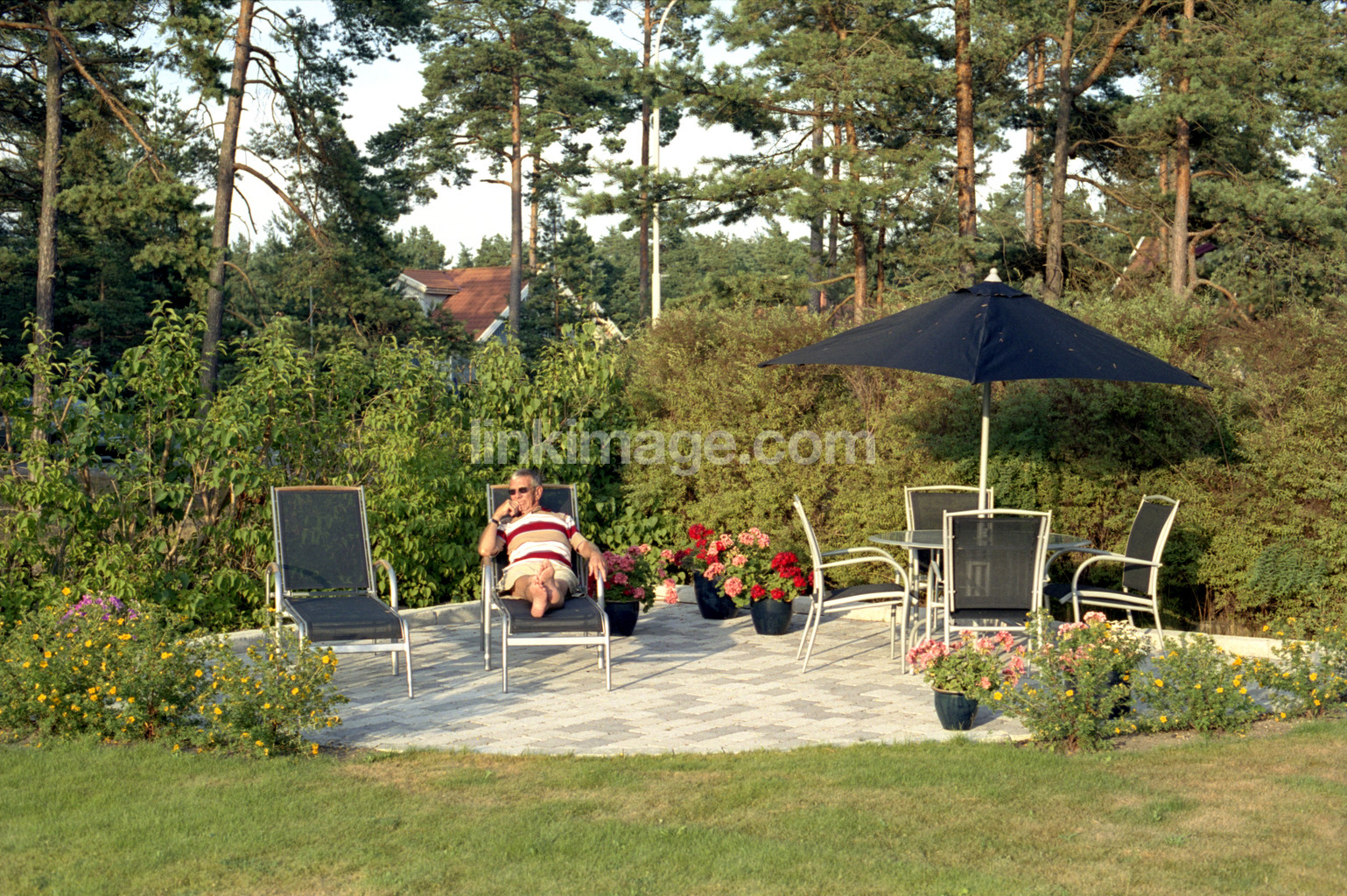 - sit, chair, garden, rest, sunbathing, out, furniture, greenery, summer, parasol, flowers, patio, bushes, tree, unscheduled, older, male