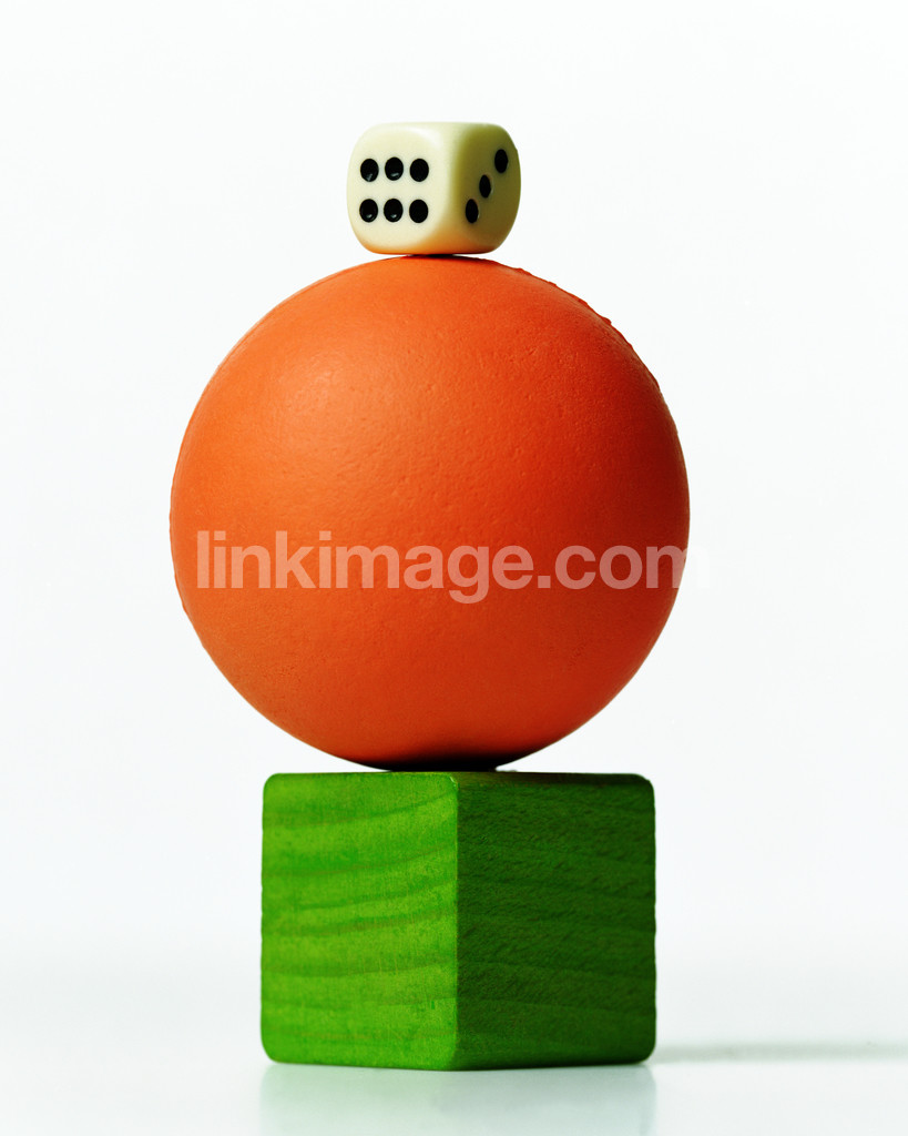 - dice, ball, block, six, three, dots, green, orange, black, still life, isolated, balance