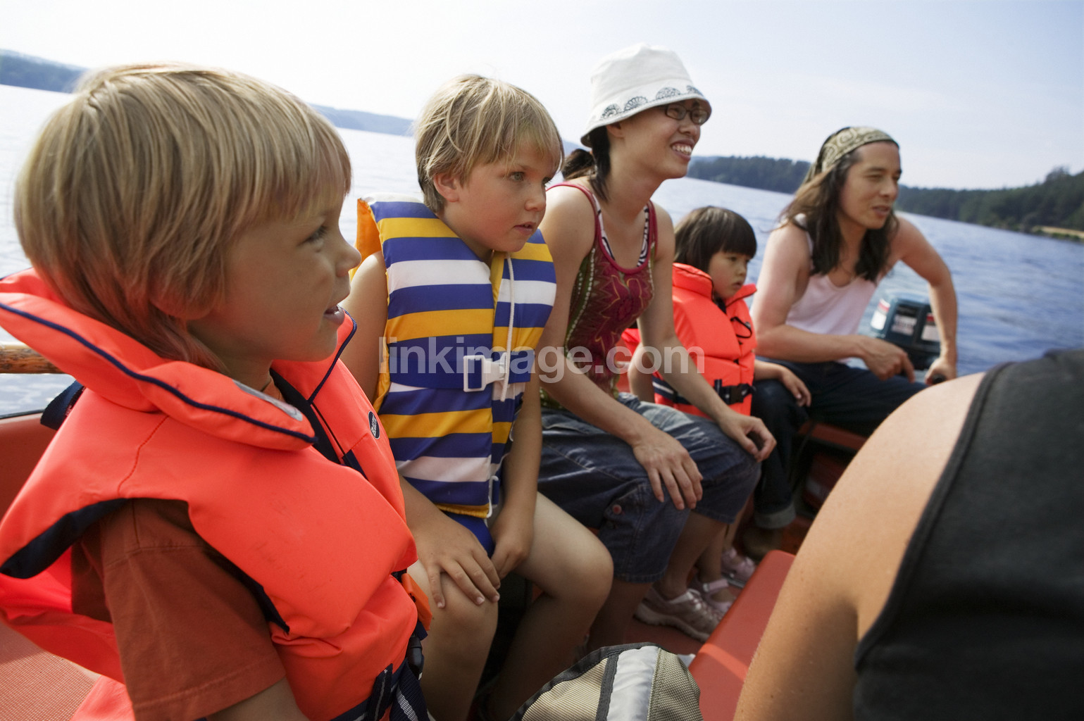 - excursion, together, family, boat, lake, life jacket, summer, adults, children