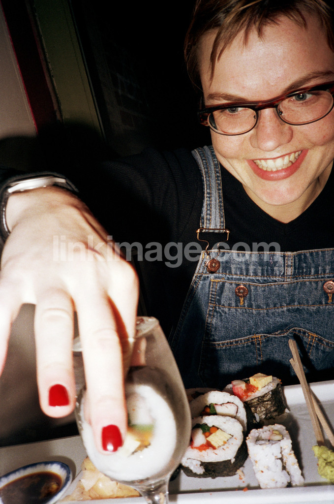 - happy, food, sushi, accident, water, restaurant, girl, glass, fingers, japanese, eyeglasses