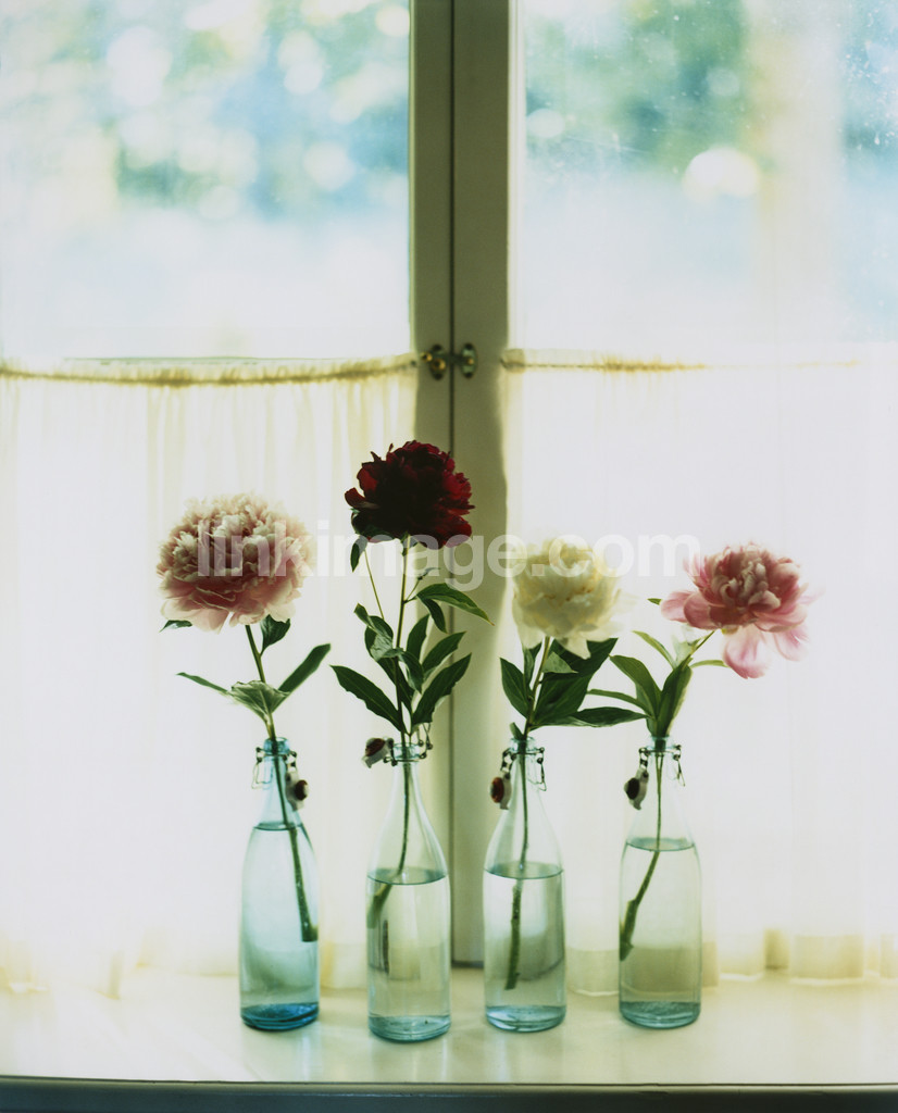- colors, vases, flowers, flower, window, bottles, four