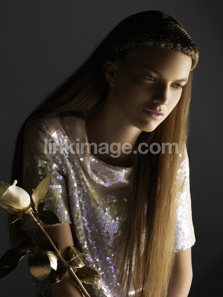 - female, girl, flower, love, rose, gold, fashion, portrait, alone, gaze, serious, sad