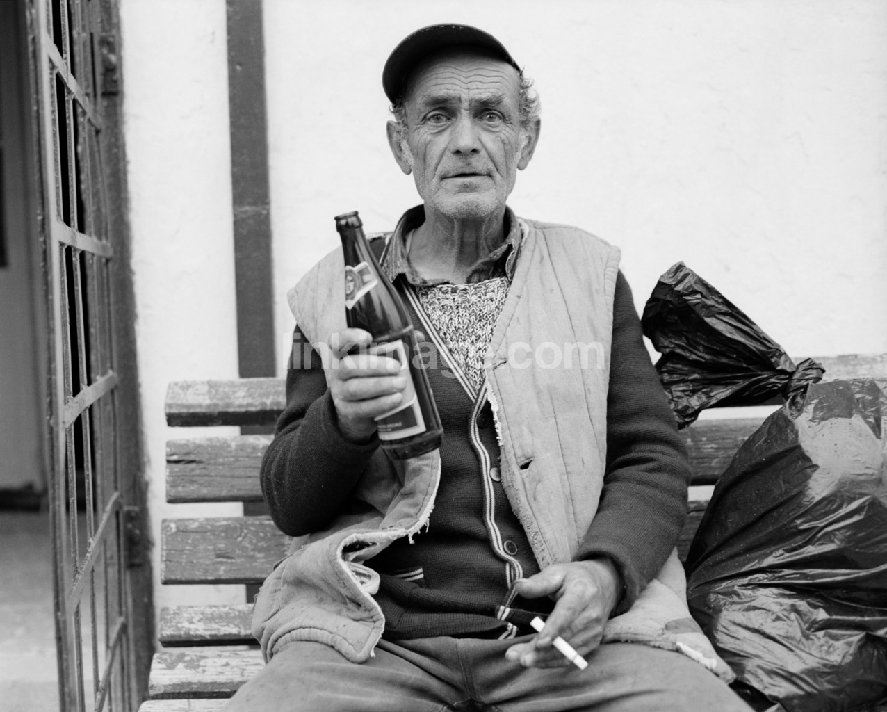 - bottle, cigarette, cig, park bench, male, health, portrait