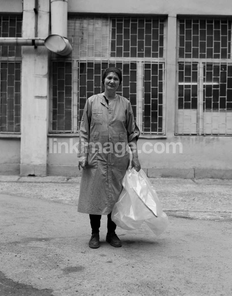 - female, street, portrait, worker, gray, uniform, workwear, plastic, bag