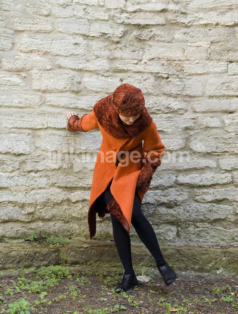 - Woman in orange gown leaning against the stone wall, gotland, sweden, 2005.