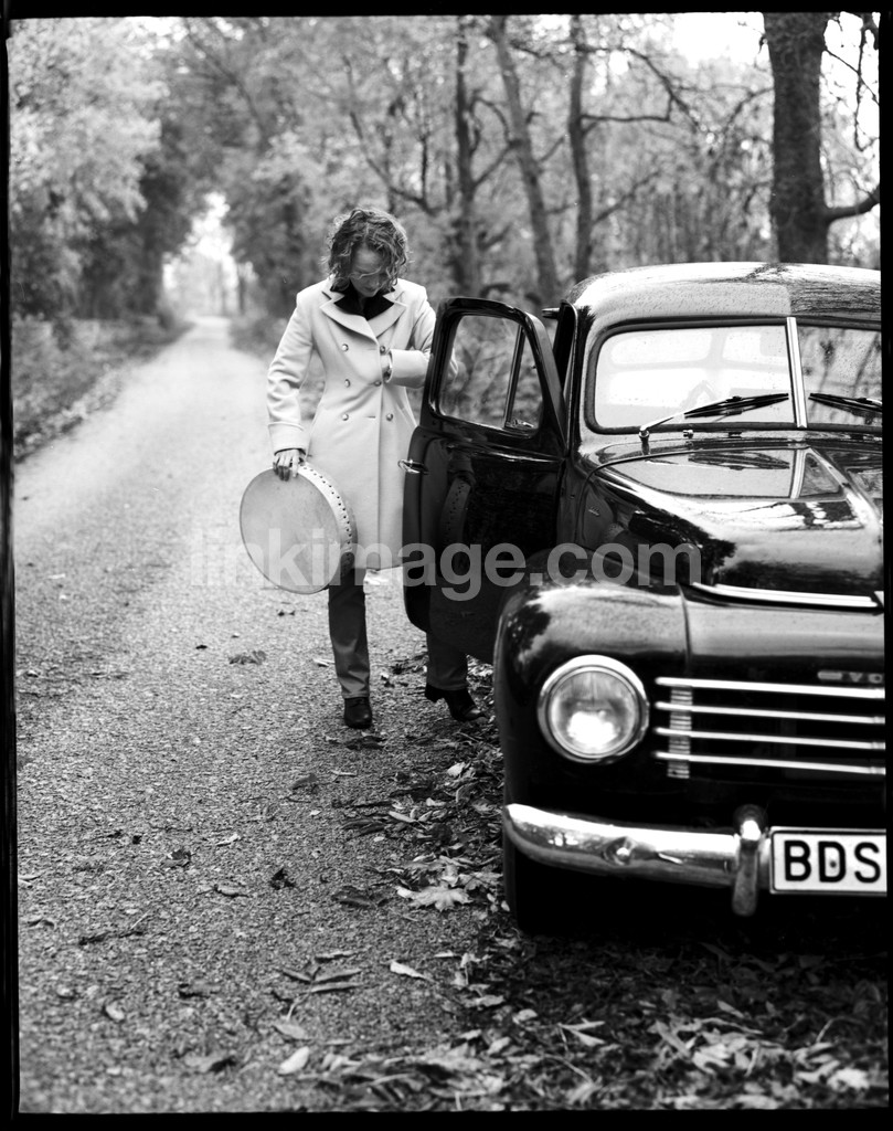 - Woman gets out of a car with a tambourine in hand, sweden 2003.