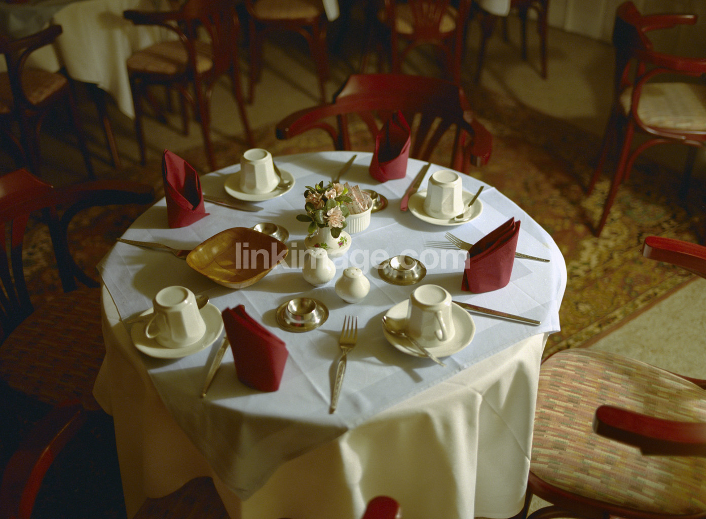 - table, table setting, copper, barrel, cutlery, napkins, cloth, chairs, else