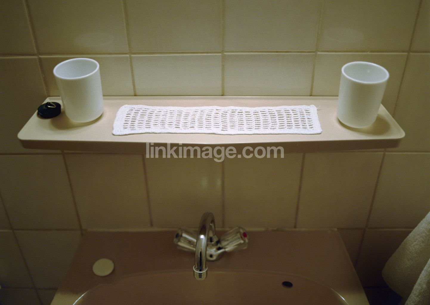 mugs, embroidery, cloth, sink, mixer, faucet, beige, soap, stopper, tile, bathroom