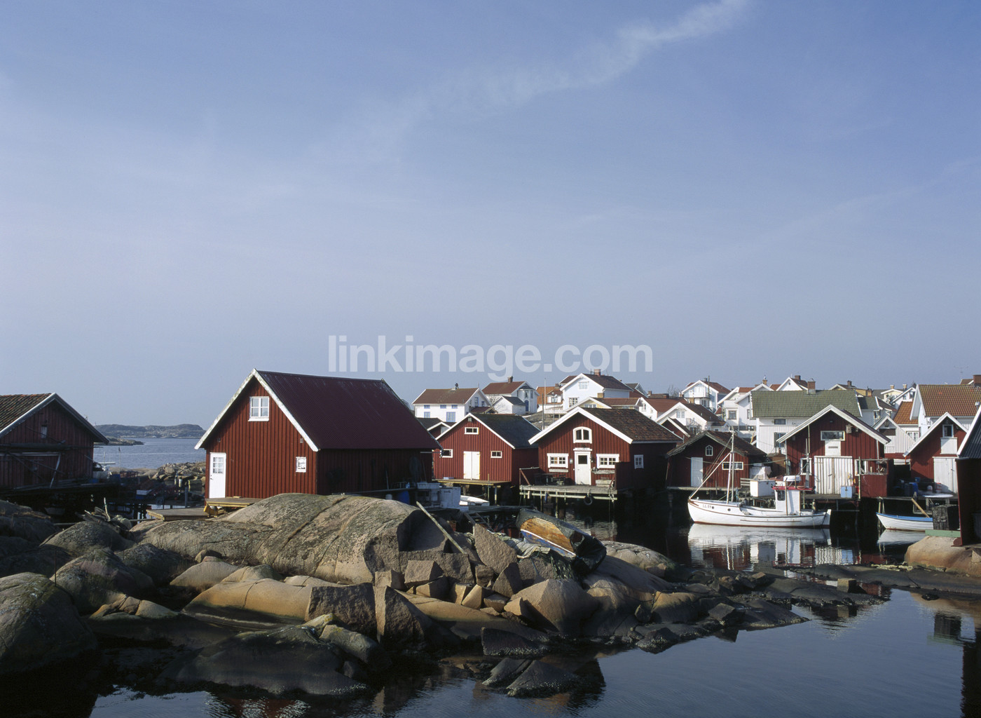- port, rocks, boathouse, wooden house, fishing boat, cottage, cottages, swedish, coast